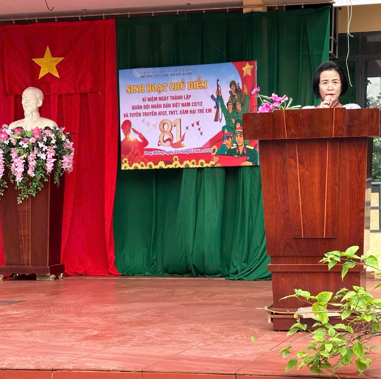 Trong chương trình, Bí thư Chi bộ, hiệu trưởng nhà trường đã có bài phát biểu ôn lại truyền thống hào hùng của Quân đội Nhân dân Việt Nam, khẳng định vai trò to lớn của quân đội trong sự nghiệp xây dựng và bảo vệ Tổ quốc. Đồng thời, đồng chí cũng căn dặn các em học sinh chăm ngoan, học giỏi, chấp hành tốt luật an toàn giao thông, biết phòng tránh tai nạn thương tích và mạnh dạn lên tiếng khi gặp nguy cơ bị xâm hại.