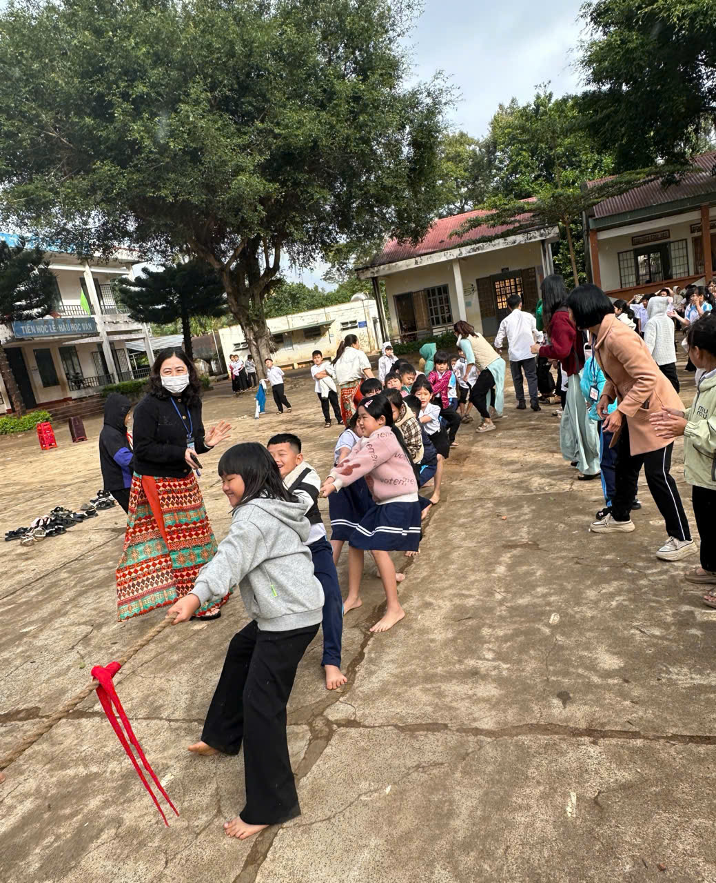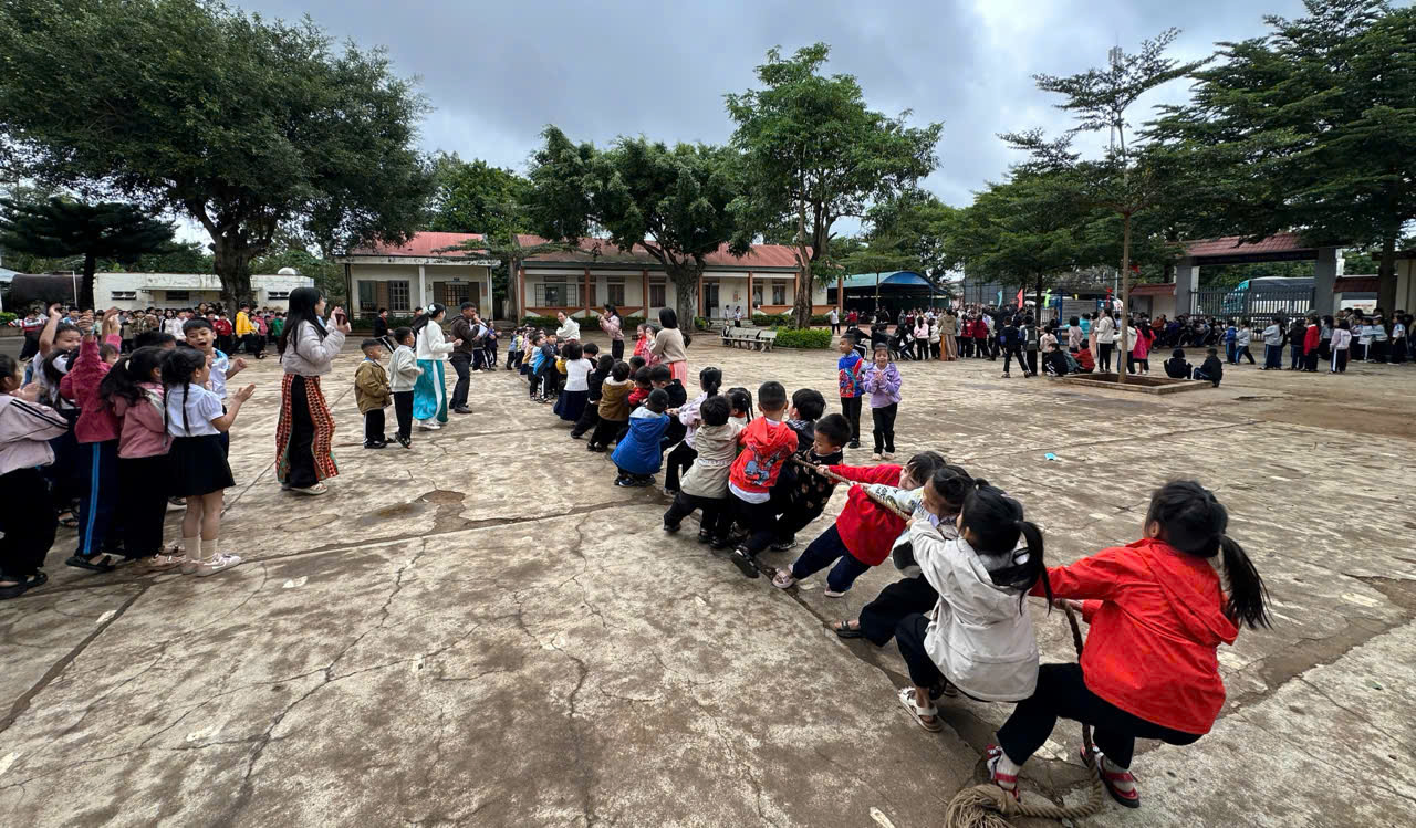 Phần cuối của buổi sinh hoạt là hoạt động trò chơi kéo co giữa các khối lớp. Trò chơi diễn ra sôi nổi, hào hứng, thể hiện tinh thần đoàn kết, giao lưu, rèn luyện sức khỏe và mang lại nhiều tiếng cười cho thầy cô và học sinh.